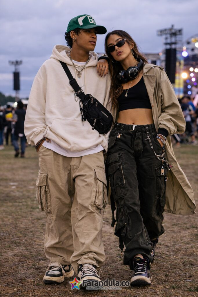 Cargo pants, jeans baggy, hoodies, chaquetas bomber y sneakers resistentes dominan este tipo de outfits, que combinan comodidad con una estética urbana muy presente en festivales.