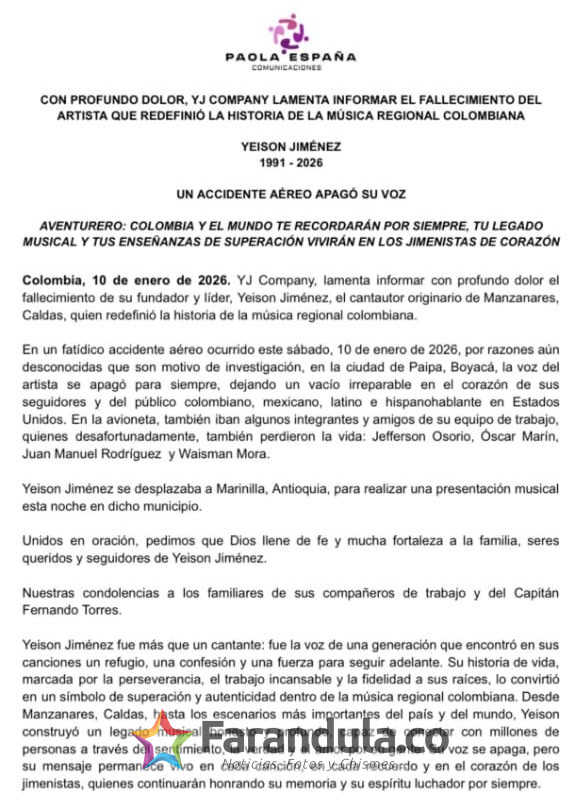 Colombia, 10 de enero de 2026. YJ Company, lamenta informar con profundo dolor el fallecimiento de su fundador y líder, Yeison Jiménez, el cantautor originario de Manzanares, Caldas, quien redefinió la historia de la música regional colombiana.